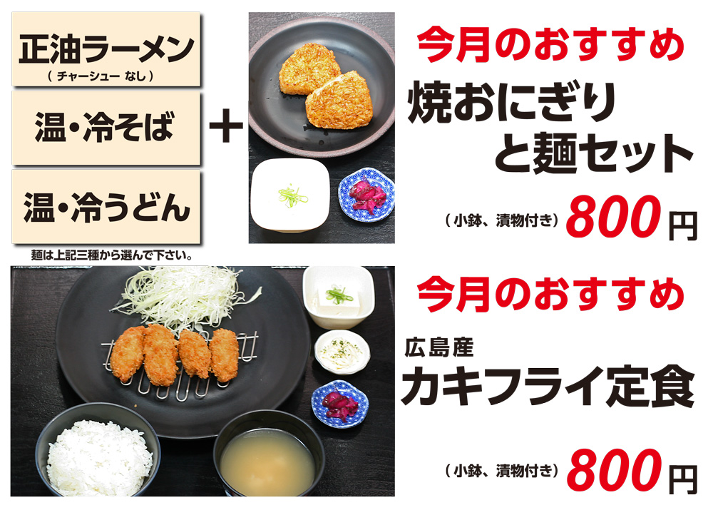 麺セットは『焼おにぎり』 定食は『カキフライ』です。