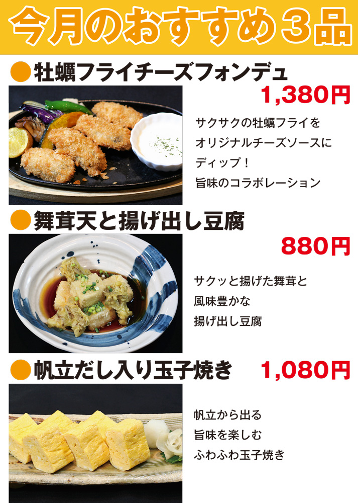 坊ちゃん南瓜グラタン 舞茸天と揚げ出し豆腐 帆立だし入り玉子焼き です。