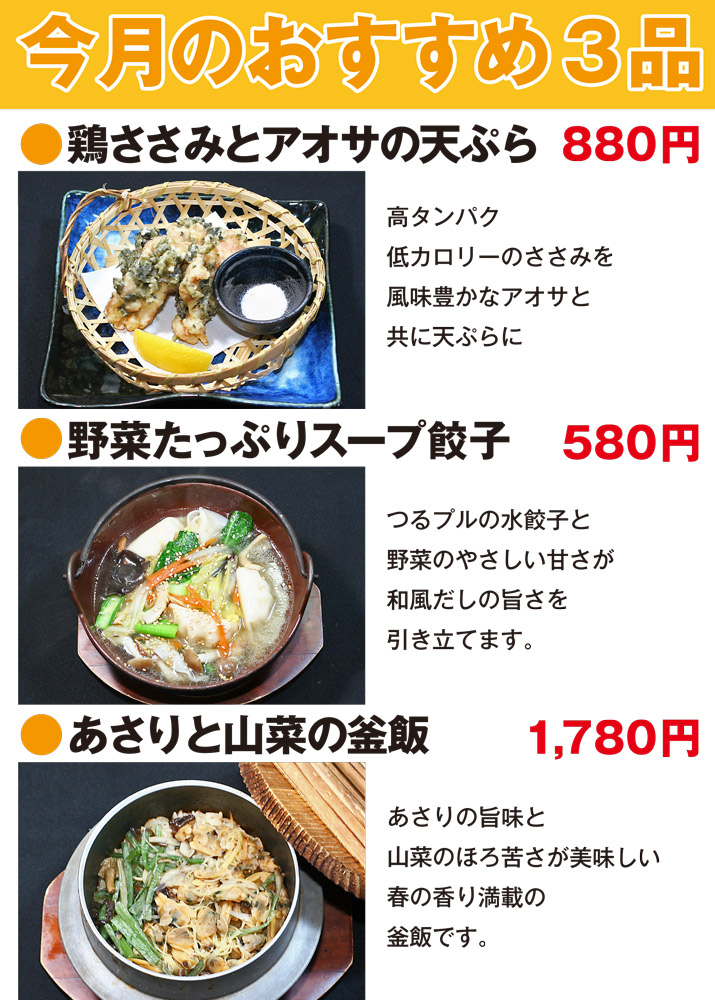 今月は『鶏ささみとアオサの天ぷら』 『野菜たっぷりスープ餃子』 『あさりと山菜の釜飯』です。